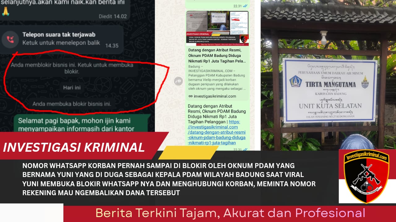 Badung, INVESTIGASIKRIMINAL.COM – Jum’at 27 Feb 2026 – Seorang pelanggan PDAM wilayah Banjar Kangin, Kecamatan Kuta Selatan, Kabupaten Badung, mengaku mengalami masalah dengan oknum petugas yang menggunakan nama Iketut Parwata. Kasus ini bermula ketika korban melakukan pembayaran tagihan melalui transfer, namun dana tersebut tidak tercatat masuk ke kantor PDAM Ungasan.